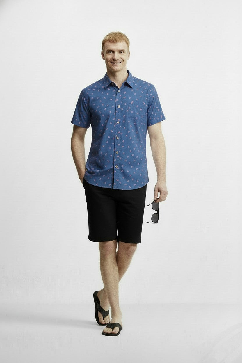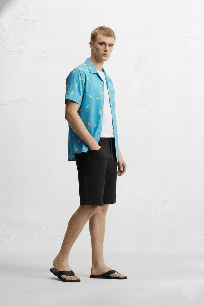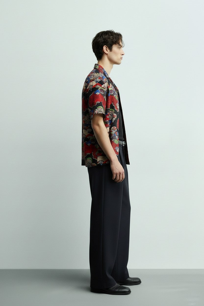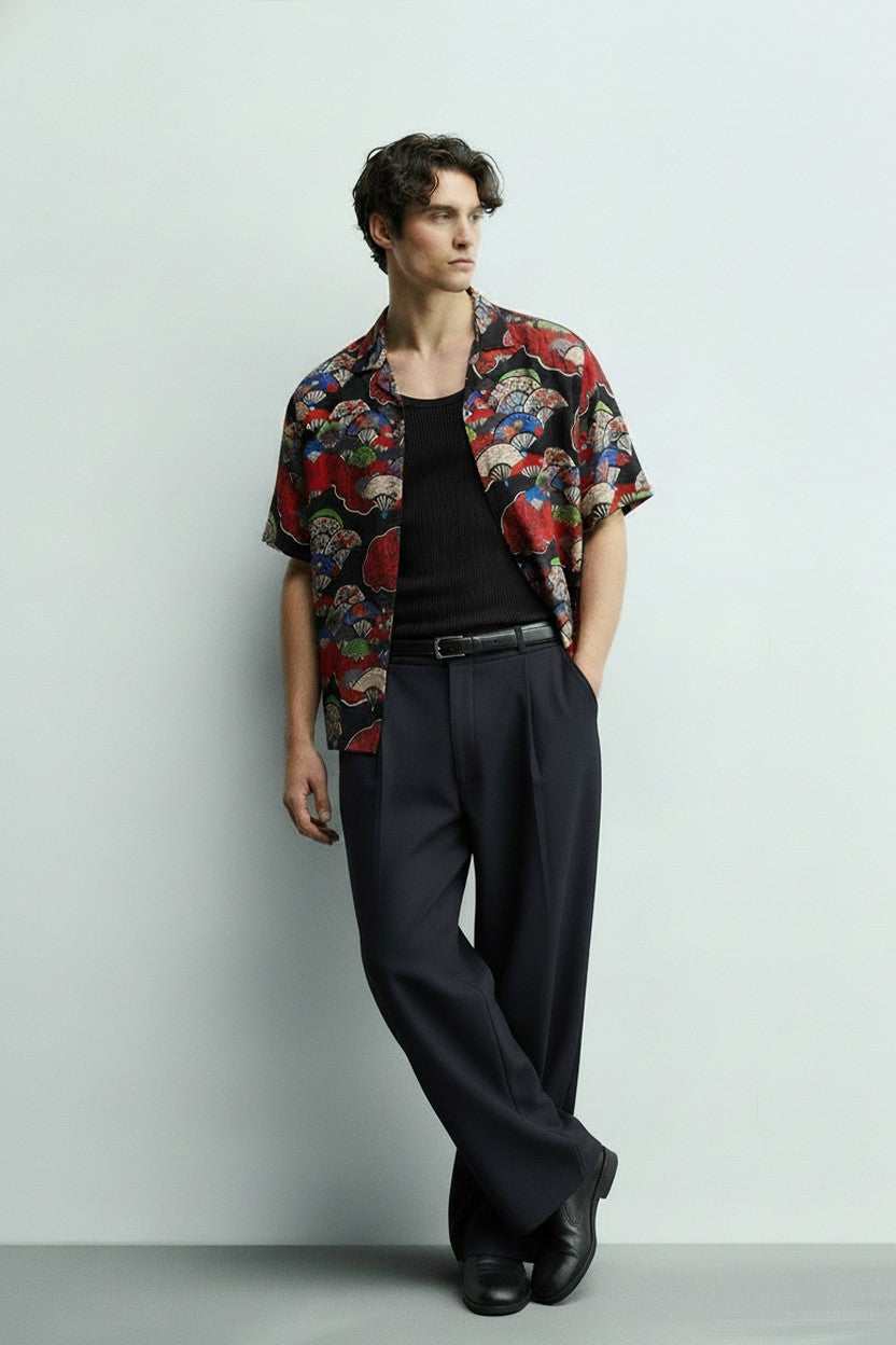FAN PRINT CAMP COLLAR SHORT SLEEVE SHIRT