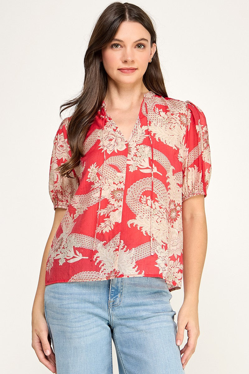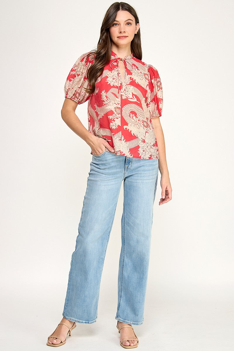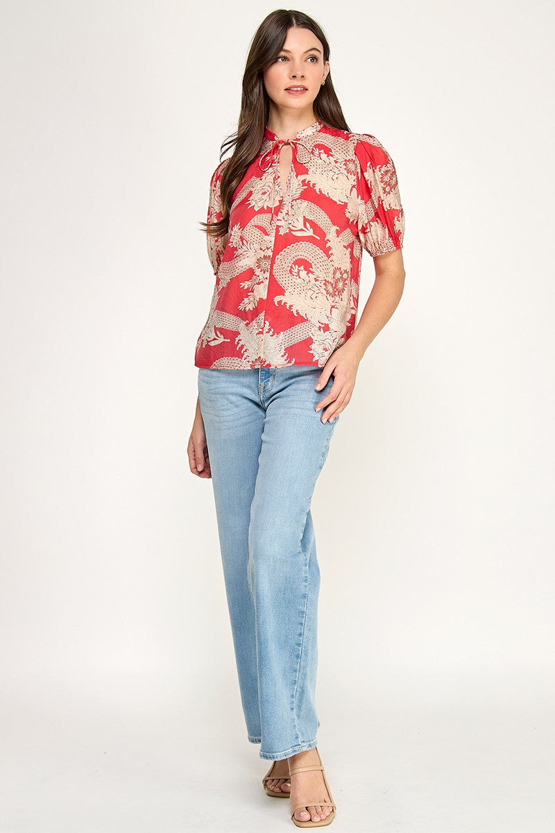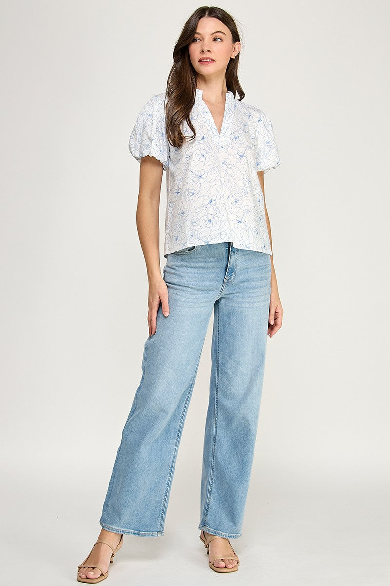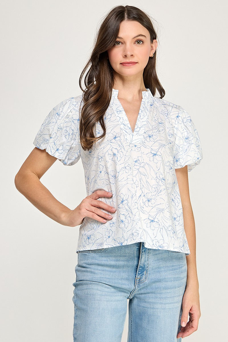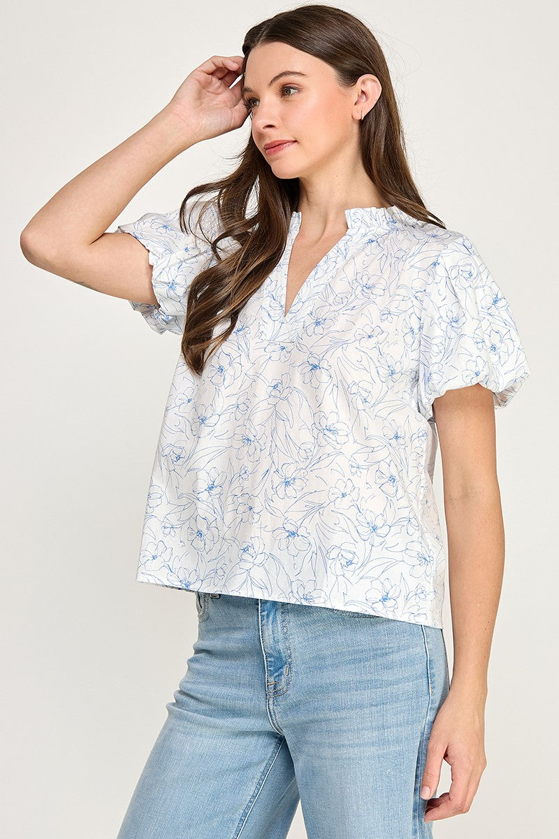 SKETCHED FLORAL SPLIT NECK PUFF SLEEVE BLOUSE