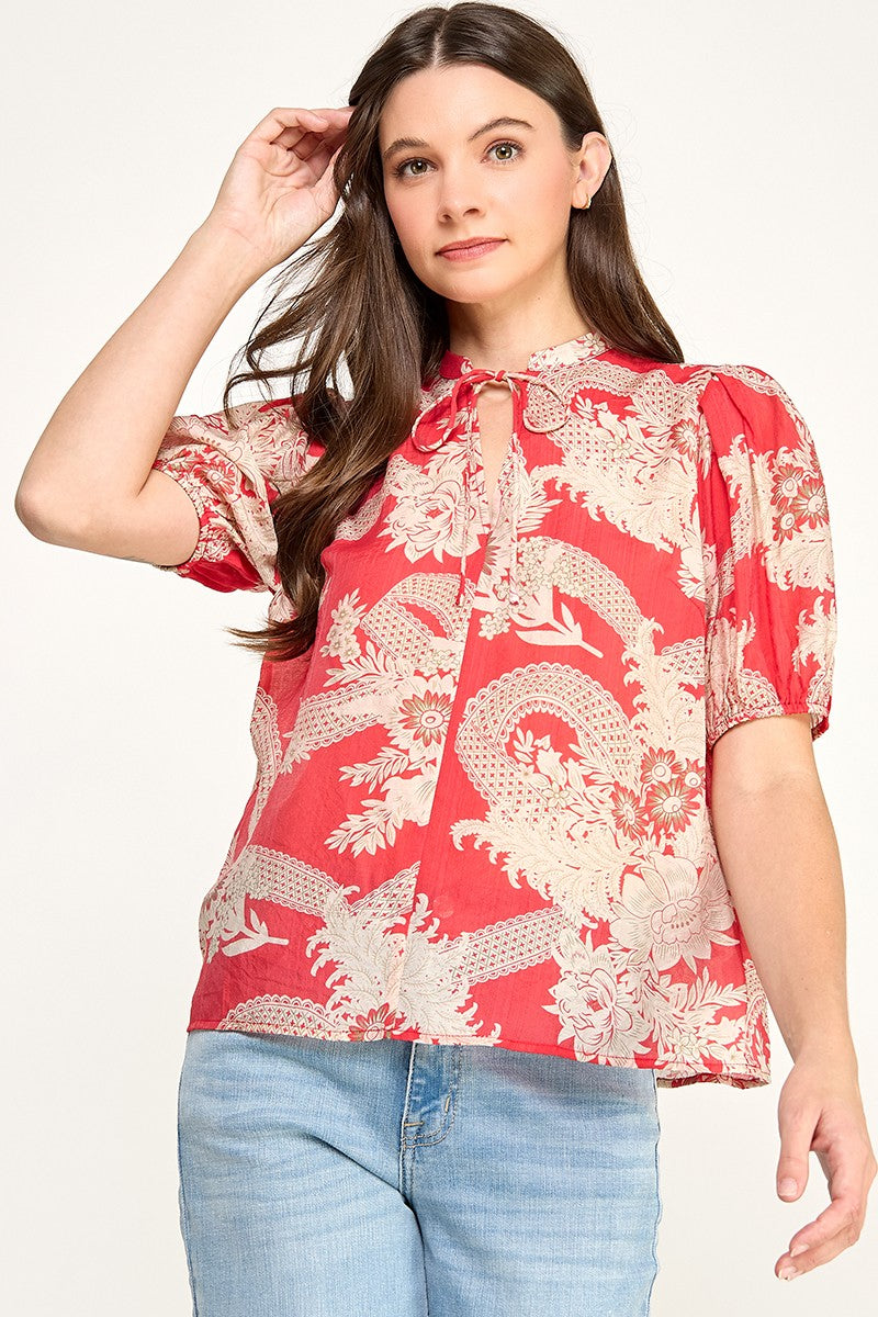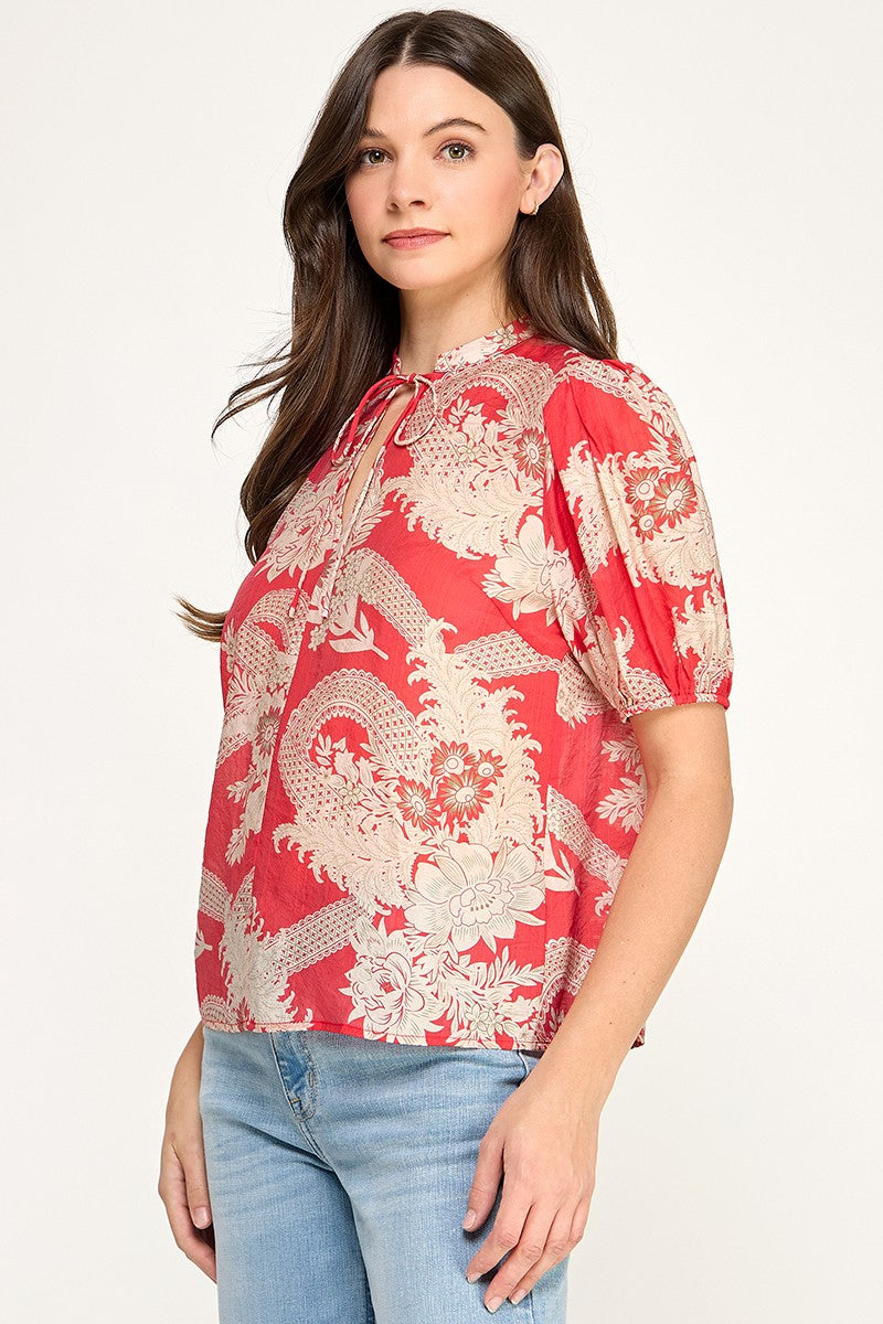FLORAL & LACE PRINT TIE NECK PUFF SLEEVE BLOUSE